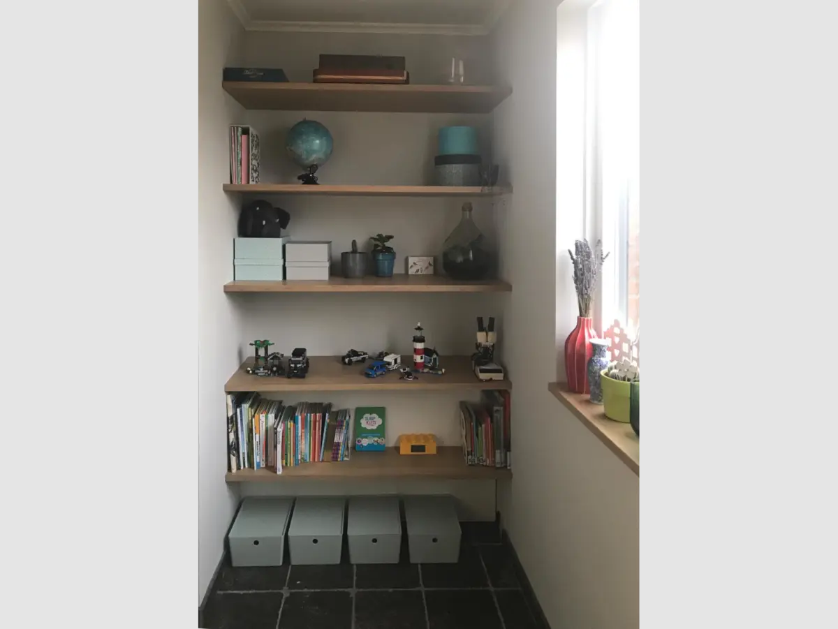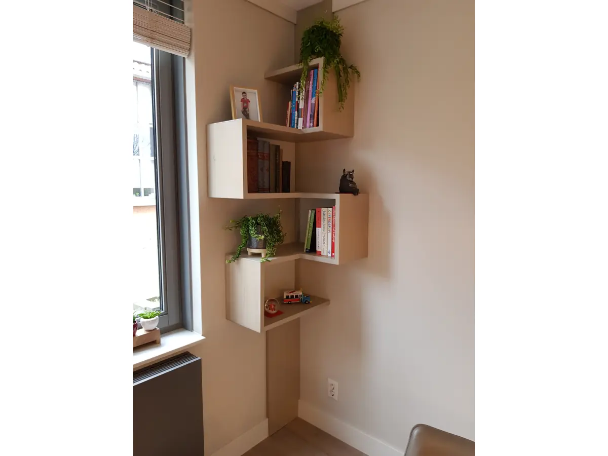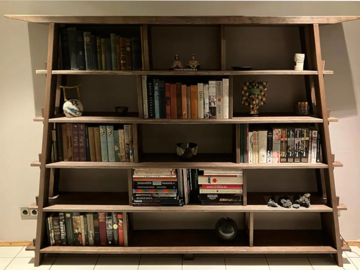 Dit is een klein boekenrekje voor op het bureau of op een dressoir in japanse stijl gemaakt. Dat wil zeggen strakke lijnen, afgeschuinde hoeken in plaats van afgeronde, en geen gebruik gemaakt van lijm.